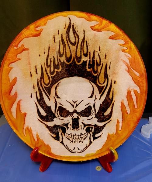 BRILLIANT AND ON FIRE, Wood burned skull, sealed in epoxy. Stand in Red and Yellow is Included.